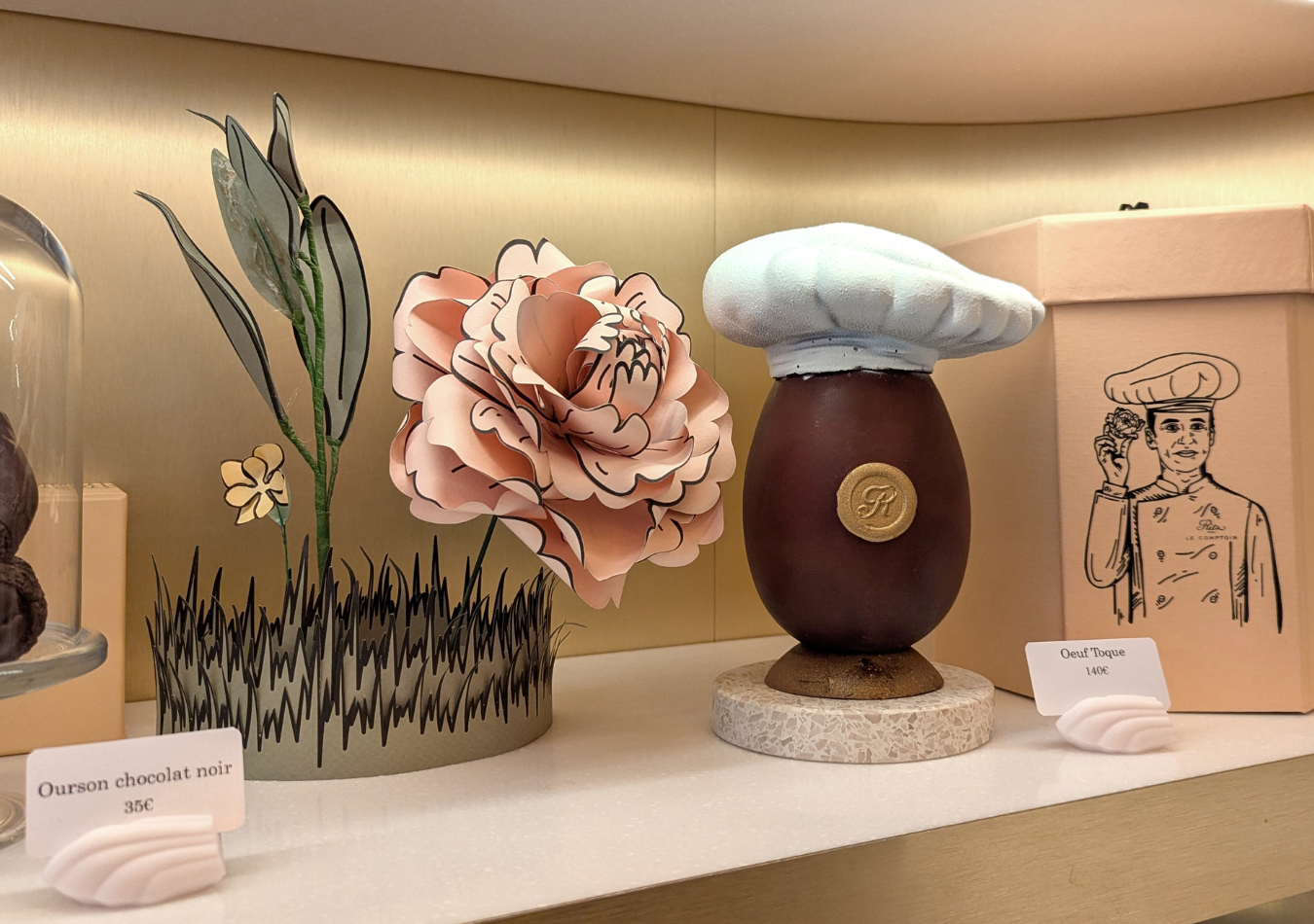 Je développe en proposant une implantation à la collection puis au produit. La proposition doit tenir compte des stocks, et doit faciliter le travail pour l’équipe de vente. Pour faire voyager le client, des éléments de signalétiques sont intégrés ; des badges avec le « R » du logo pour identifier les produits personnalisables, des panneaux reprenant le design de ceux de l’Hôtel parisien…
